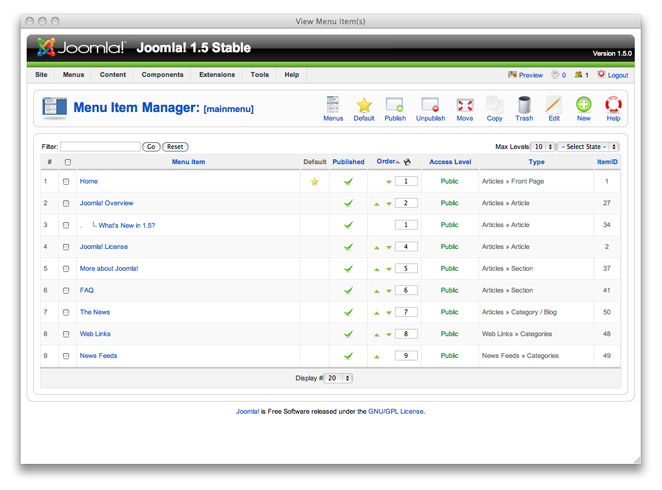 The complexity of choices and steps in the menu manager for Joomla! 1.0 have been completely redesigned for 1.5 in favor of simplicity and elegance.[1] Usability improvements, such as the ability now to change the menu type[3], make changing your site much simpler. Any menu item can now be used to designate the default page. Selecting menu types is now an elegant drill down process supported by a new navigation tree; collapsible parameter sections simplify choices and increase productivity. Other helpful interface improvements include contextual tooltips and the ability to sort any menu manager column. [2]
