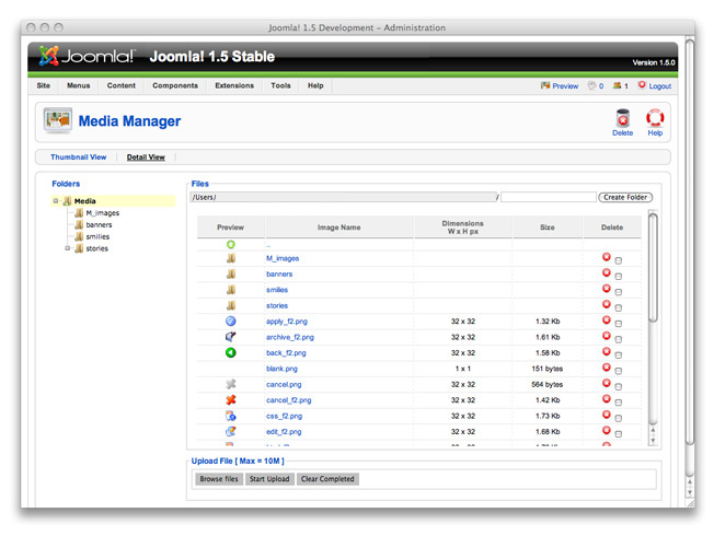 Joomla! administrators will find a number of improvements in ease of site management. A single installer is available for all extension types, including languages. [5] The media manager is improved visually and functionally. Images, documents, presentations, and more, can now be stored. Other improvements include multi-delete capability, batch file uploads, and an ability to view media in icon and list formats. [4]