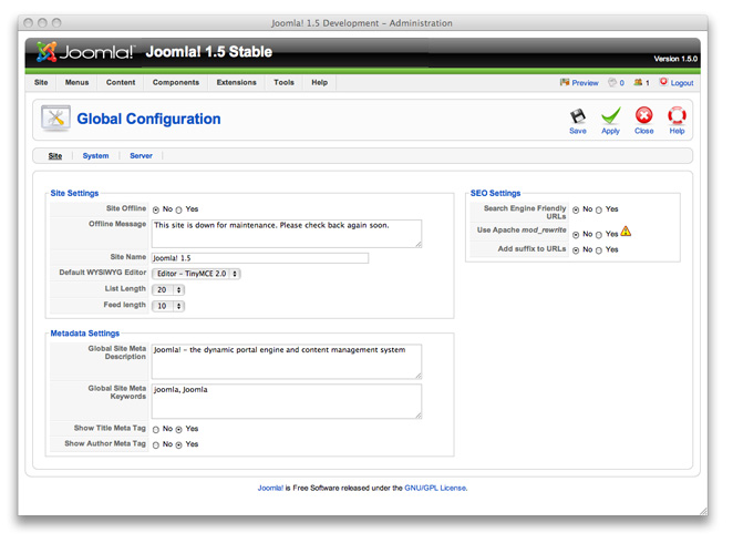 One of the more significant functional improvements are search engine friendly URLs, easily implemented within the global configuration. With SEF URLs in place, system generated duplicate content is eliminated, greatly improving site search engine optimization.